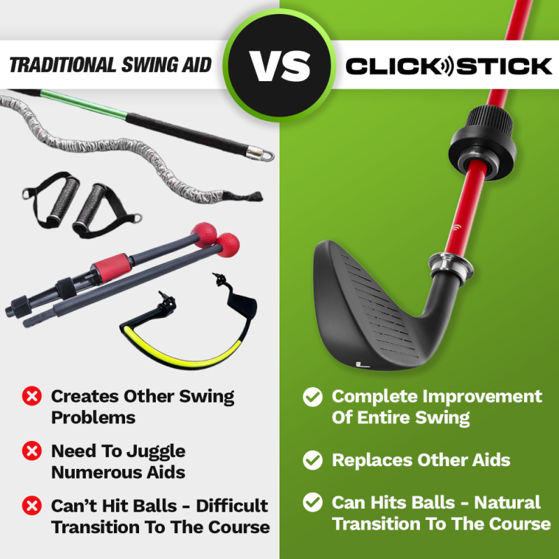 The Click Stick is the first swing trainer with a built in “perfect practice system”… that increases your swing speed, fixes your release, and dials in your clubface control for more accuracy – FOR YOU… simply by swinging and listening for the “CLICK!”